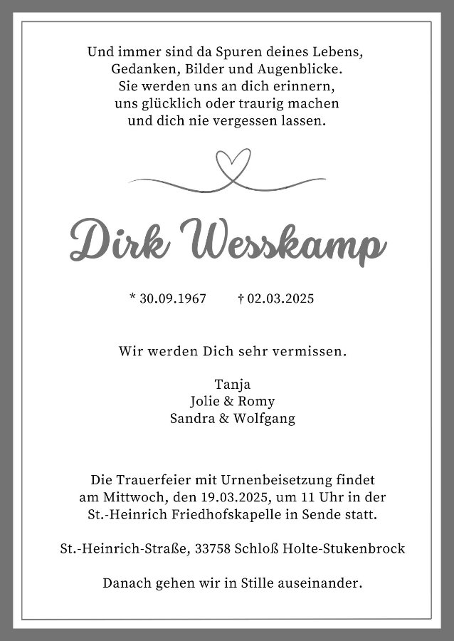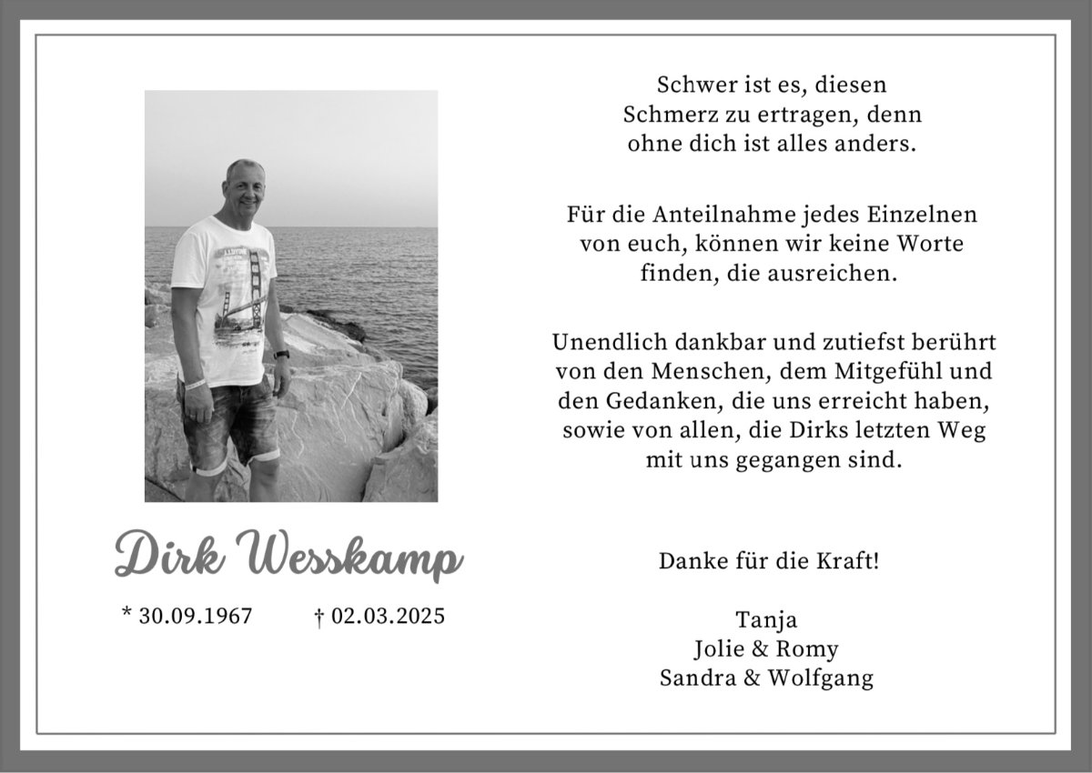 "Dirkii , du warst unser Halt, unser Herz und unser Zuhause. Deine Liebe, deine Wärme und dein Lachen bleiben für immer in unseren Herzen. Wir vermissen dich unendlich."
