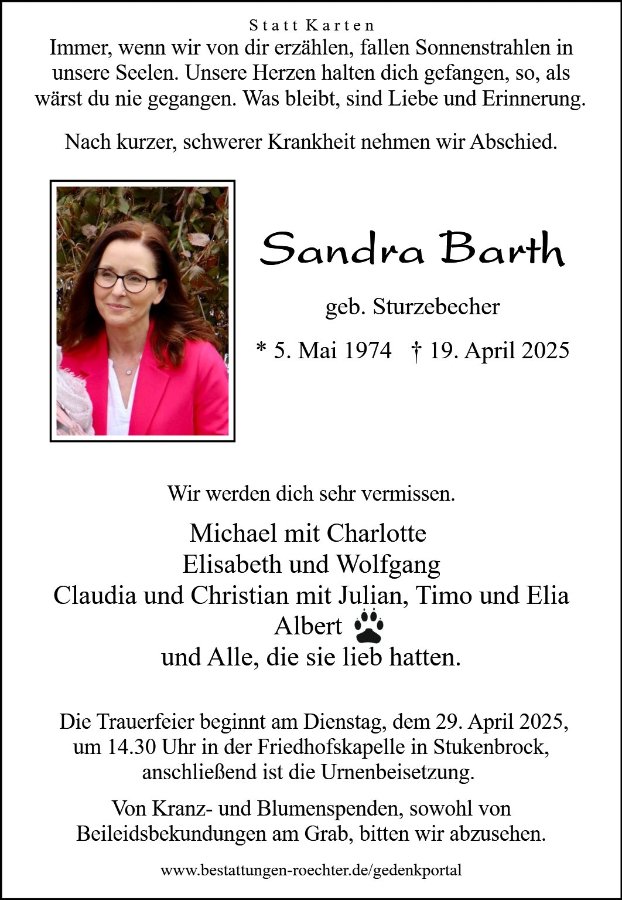 wir haben vom Tod Deiner lieben Ehefrau Sandra gehört und sind darüber sehr traurig. Wir möchten Euch unser